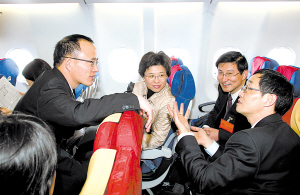 3月2日,新老代表在赴京飛機上就相互勉勵,要積極參政議政。圖為杜斌、張喆人、姚莉、郭廣昌(自右至左)四位代表在熱烈交談。記者 郭天中