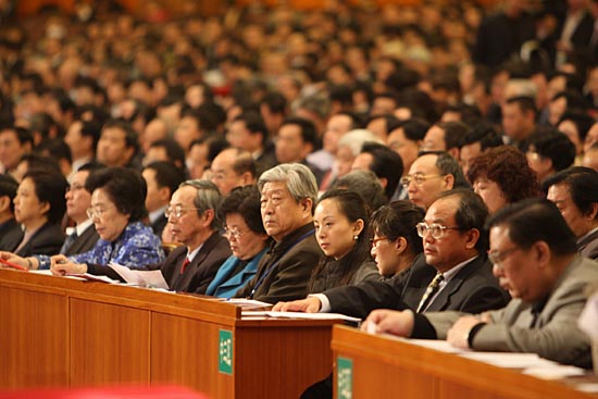 | 3月3日,中國人民政治協商會議第十一屆全國委員會第一次會議在北京人民大會堂開幕。這是委員們在認真聽會。新華社記者
