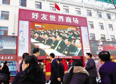 兩會成為舉世注目的焦點。圖為在北京繁華的王府井金街,巨幅電視墻上轉播兩會實況吸引了過往行人駐足觀看。