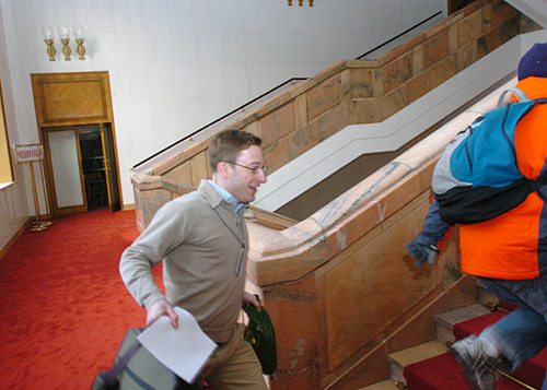 3月5日上午9時,第十一屆全國人民代表大會第一次會議在人民大會堂開幕,聽取國務院總理溫家寶作政府工作報告,審查年度計劃報告和預算報告。圖為外國記者為搶占位置在大會堂樓梯上奔跑。