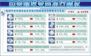 預算報告顯示,涉及民生、科學技術、環保以及糧油物資儲備等方面的支出均超預算。具體來看,教育支出1076.35億元,增長76%,完成預算的125.4%;科學技術支出999.99億元,增長26%,完成預算的113.5%;社會保障和就業支出2303.16億元,增長13.7%,完成預算的114.1%;環境保護支出782.1億元,增長61%,完成預算的164.7%;農林水事務支出1274.49億元,增長43.9%,完成預算的106.2%;工業商業金融等事務(包括安全生產、糧棉油等重要物資儲備、解決政策性糧食財務掛賬本息等方面的事務)支出2429.16億元,增長41%,完成預算的127.9%;對地方稅收返還和財力性轉移支付支出10924.35億元,增長21.2%,完成預算的108.1%。