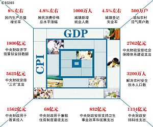 根據今年的預算安排,教育支出將達1561.76億元,增長45.1%;科學技術支出1133.98億元,按可比口徑增長26%;社會保障和就業支出2761.61億元,按可比口徑增長24.2%;醫療衛生支出831.58億元,增長25.2%;環境保護支出1027.51億元,增長31.4%;農林水事務支出1450.49億元,按可比口徑增長17.2%;工業商業金融等事務(包括安全生產、糧棉油等重要物資儲備、解決政策性糧食財務掛賬本息等方面的事務)支出3373.24億元,增長38.9%;國防支出4099.4億元,增長17.7%;一般公共服務支出2655.4億元,增長14.3%,其中國內外債務付息1235.66億元,增長24.4%;對地方稅收返還和財力性轉移支付12317.81億元,增長12.8%。