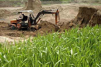 2007年5月21日,一輛鏟車在甘肅省臨夏市枹罕鎮的一處農田邊取土,用于燒制國家早已明令禁止的實心磚瓦,當地30多家磚瓦生產企業在基本農田保護區范圍內取土,造成上千畝水澆地大幅度減產甚至無法耕種。新華社發(資料照片) | “我國城市化、工業化的加速和目前建設用地緊缺的矛盾十分突出。2020年要達到城市化率60%、工業化率70%的目標,需要增加1.5億畝建設用地。而在18億畝耕地‘紅線’下,未來13年實際可以增加的建設用地不足3000萬畝。城市化與耕地保護之間面臨尖銳矛盾,必須妥善加以解決!”全國政協委員、清華大學人文學院經濟研究所副所長蔡繼明接受記者采訪時對城市化與耕地保護這對矛盾表達了自己的憂慮。 和蔡繼明委員的關注相同,記者采訪發現,在本次兩會上,如何妥善保護耕地這一話題在代表委員們中間引發了熱議,他們建議盡快促進農村集體建設用地流轉,同時,呼吁地方政府摒棄“賣地財政”行為。