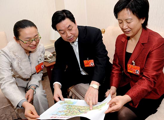 | 圖為來自河南的趙素萍代表(右)、來自甘肅的張津梁代表(中)和畢紅珍代表(左)在一起討論建議規劃建設線路示意圖。 |