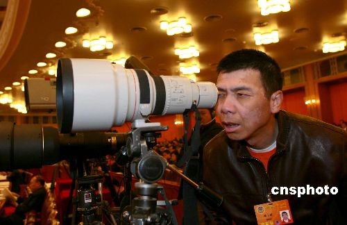 全國政協十一屆一次會議第二次全體會議在北京人民大會堂舉行。著名導演、北京電視藝術中心的馮小剛委員在大會堂借用攝影記者的長焦鏡頭細觀會場。
