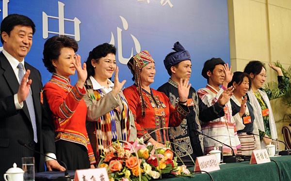 3月10日,在北京出席十一屆全國人大一次會議的8位少數民族代表在北京兩會新聞中心接受記者集體采訪。