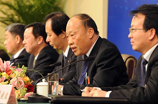 3月11日,兩會新聞中心舉行“鋼鐵行業與發展”專題采訪,5位鋼鐵業全國人大代表共同接受中外記者采訪。這是崔臣、鄧崎琳、張曉剛、朱繼民、李曉波(自左至右)在記者會上。
