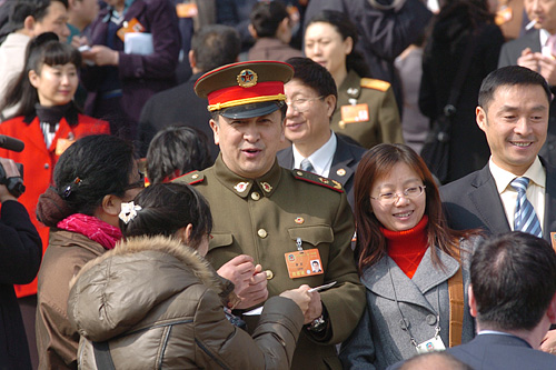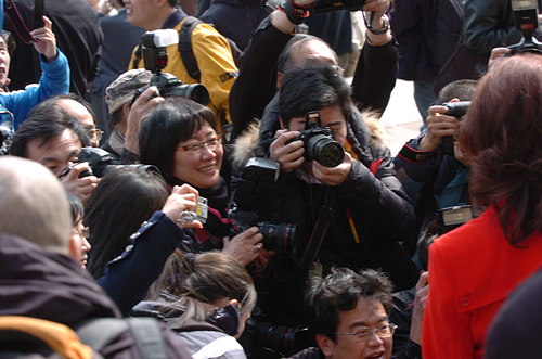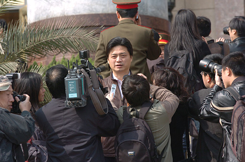 3月14日,中國人民政治協商會議第十一屆全國委員會第一次會議在北京人民大會堂舉行閉幕會。圖為當日在大會堂外的廣場上被記者“圍堵”采訪的政協委員。
