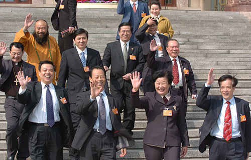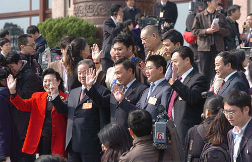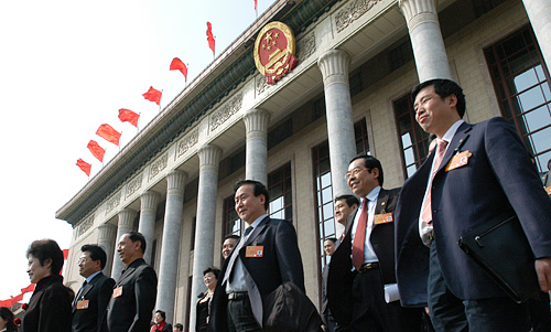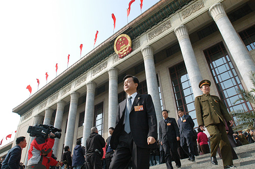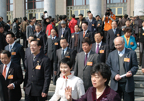 3月14日,中國人民政治協商會議第十一屆全國委員會第一次會議在北京人民大會堂舉行閉幕會。圖為會后委員們走出人民大會堂。