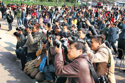 敬業的記者們成為兩會的一道風景線。圖為記者在北京人民大會堂東門外搶拍鏡頭。