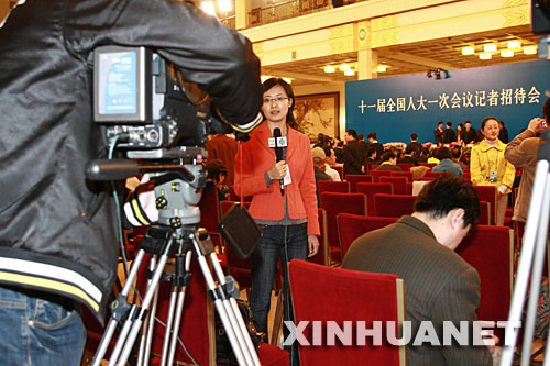 3月18日上午8時30分,人民大會堂三樓記者席已是“座無虛席”。這是電視記者在現場試鏡。