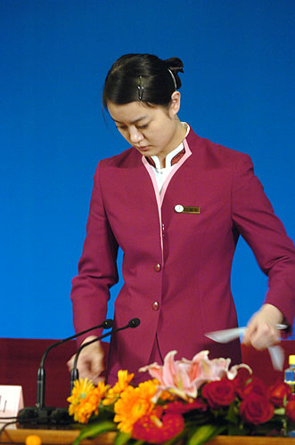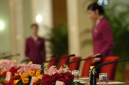 3月18日上午十一屆全國人大一次會議閉幕后,國務院總理溫家寶在人民大會堂三樓中央大廳與采訪十一屆全國人大一次會議的中外記者見面并回答記者提出的問題。圖為工作人員在作準備。