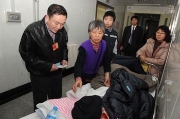 這是3月9日,全國政協委員卞志良(左一)在北京朝陽醫院看望一位等候就醫的患者。卞志良利用休會的半天時間,專程前往北京朝陽醫院,就醫療改革進行走訪調研。他著重對藥品價格,看病難、用藥貴等問題征詢了醫患雙方的意見,希望以此進一步完善有關城鄉醫療改革的提案。