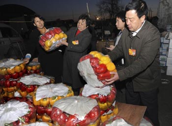 3月12日凌晨,來自山東的三位基層人大代表劉建文(左一)、王銀香(左二)和牛寶偉(右一)趕到北京新發地批發市場,聽取市場內物流、批發商以及市民的意見。