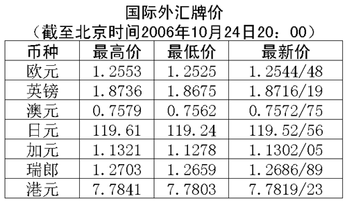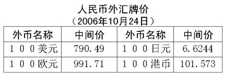 根據中國人民銀行授權中國外匯交易中心發布的公告,2006年10月24日銀行間外匯市場美元等交易貨幣對人民幣匯率的中間價為:1美元兌人民幣7.9049元,1歐元兌人民幣9.9171元,100日元兌人民幣6.6244元,1港元兌人民幣1.01573元,1英鎊兌人民幣14.8032元。