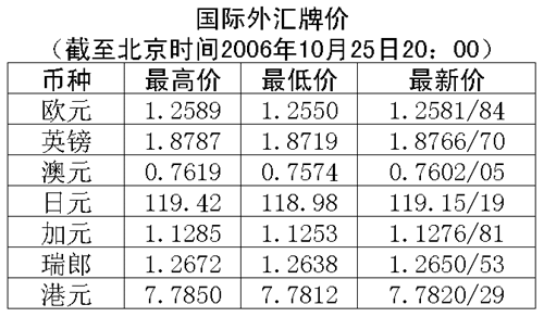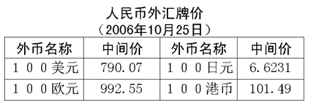 根據中國人民銀行授權中國外匯交易中心發布的公告,2006年10月25日銀行間外匯市場美元等交易貨幣對人民幣匯率的中間價為:1美元兌人民幣7.9007元,1歐元兌人民幣9.9255元,100日元兌人民幣6.6231元,1港元兌人民幣1.01490元,1英鎊兌人民幣14.8036元。