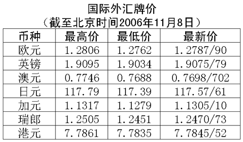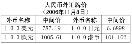 根據中國人民銀行授權中國外匯交易中心發布的公告,2006年11月8日銀行間外匯市場美元等交易貨幣對人民幣匯率的中間價為:1美元兌人民幣7.8719元,1歐元兌人民幣10.0561元,100日元兌人民幣6.6898元,1港幣兌人民幣1.01102元,1英鎊兌人民幣15.0027元。