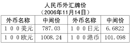 根據中國人民銀行授權中國外匯交易中心發布的公告,2006年11月14日銀行間外匯市場美元等交易貨幣對人民幣匯率的中間價為:1美元兌人民幣7.8703元,1歐元兌人民幣10.0824元,100日元兌人民幣6.6822元,1港幣兌人民幣1.01098元,1英鎊兌人民幣14.9739元。