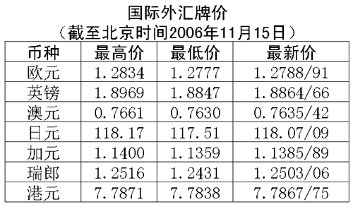 根據中國人民銀行授權中國外匯交易中心發布的公告,2006年11月15日銀行間外匯市場美元等交易貨幣對人民幣匯率的中間價為:1美元兌人民幣7.8715元,1歐元兌人民幣10.0839元,100日元兌人民幣6.6895元,1港幣兌人民幣1.01105元,1英鎊兌人民幣14.9251元。