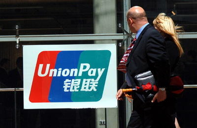 16日,兩名澳大利亞商務人士從墨爾本一處中國銀聯卡廣告招貼牌前走過。當天,中國銀聯與澳大利亞國民銀行在墨爾本正式舉行了銀聯卡在澳大利亞受理業務開通儀式,中國銀聯卡的持有人已能夠在澳大利亞部分提款機和商戶受理終端機上使用銀聯卡提款和消費。