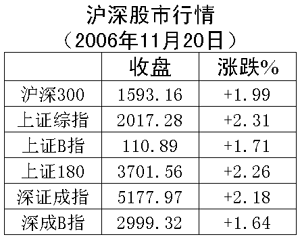 來自滬深證券交易所的統計數據顯示,上證綜指開盤1977.53點,最高2018.00點,最低1977.53點,收盤2017.28點,上漲45.49點,漲幅2.31%,成交333.69億元;深圳成指開盤5080.49點,最高5179.75點,最低5080.49點,收盤5177.97點,上漲110.45點,漲幅2.18%,成交175.21億元。