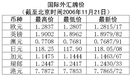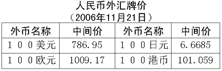 根據中國人民銀行授權中國外匯交易中心發布的公告,2006年11月21日銀行間外匯市場美元等交易貨幣對人民幣匯率的中間價為:1美元兌人民幣7.8695元,1歐元兌人民幣10.0917元,100日元兌人民幣6.6685元,1港幣兌人民幣1.01059元,1英鎊兌人民幣14.9383元。