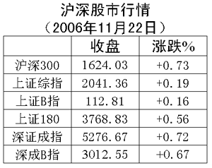 來自滬深證券交易所的統計數據顯示,當日上證綜指開盤2031.30點,最高2062.80點,最低2010.79點,報收2041.36點,上漲3.80點,漲幅0.19%;深證成指開盤5236.64點,最高5335.93點,最低5203.27點,收盤5276.67點,上漲37.57點,漲幅0.72%。滬市有638家股票上漲,176家下跌;深市有434家股票上漲,124家下跌,兩市22只股票漲停。截至收盤,滬深股市主板共成交586億元。