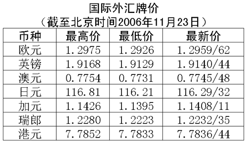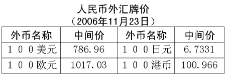 根據中國人民銀行授權中國外匯交易中心發布的公告,2006年11月23日銀行間外匯市場美元等交易貨幣對人民幣匯率的中間價為:1美元兌人民幣7.8596元,1歐元兌人民幣10.1703元,100日元兌人民幣6.7331元,1港幣兌人民幣1.00966元,1英鎊兌人民幣15.0452元。人民幣對美元匯率中間價設定為7.8596,為歷史最低。