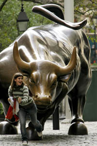 一名女子在美國紐約證券交易所附近的銅奔牛雕像前留影。經濟參考報資料圖片