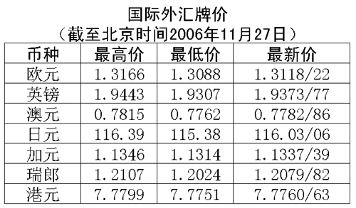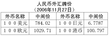 根據中國人民銀行授權中國外匯交易中心發布的公告,2006年11月27日銀行間外匯市場美元等交易貨幣對人民幣匯率的中間價為:1美元兌人民幣7.8402元,1歐元兌人民幣10.2971元,100日元兌人民幣6.7787元,1港幣兌人民幣1.00797元,1英鎊兌人民幣15.2001元。在自動撮合交易系統,美元收于人民幣7.8428元,低于24日收盤時的7.8506元,盤中交易區為人民幣7.8432-7.8406元。在詢價交易市場,美元收于人民幣7.8436元,低于24日收盤時的7.8525元,盤中交易區為人民幣7.8441-7.8410元。