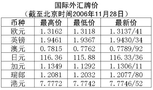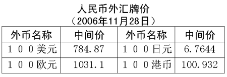 根據中國人民銀行授權中國外匯交易中心發布的公告,2006年11月28日銀行間外匯市場美元等交易貨幣對人民幣匯率的中間價為:1美元兌人民幣7.8487元,1歐元兌人民幣10.3110元,100日元兌人民幣6.7644元,1港幣兌人民幣1.00932元,1英鎊兌人民幣15.2166元。