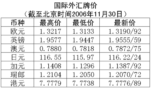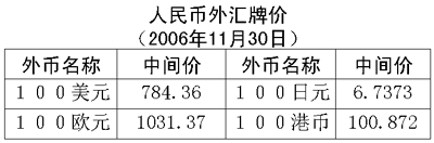 根據中國人民銀行授權中國外匯交易中心發布的公告,2006年11月30日銀行間外匯市場美元等交易貨幣對人民幣匯率的中間價為:1美元兌人民幣7.8436元,1歐元兌人民幣10.3137元,100日元兌人民幣6.7373元,1港幣兌人民幣1.00872元,1英鎊兌人民幣15.2629元。