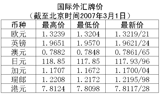 根據中國人民銀行授權中國外匯交易中心發布的公告,2007年3月1日銀行間外匯市場美元等交易貨幣對人民幣匯率的中間價為:1美元兌人民幣7.7472元,1歐元兌人民幣10.2544元,100日元兌人民幣6.5289元,1港幣兌人民幣0.99174元,1英鎊兌人民幣15.2174元。