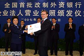 渣打、匯豐、花旗和東亞四家外資銀行29日獲得上海市工商行政管理局頒發的法人銀行營業執照,這標志著全國首批經過改制的外資銀行正式取得中國企業法人地位。記者同時獲悉,這四家銀行預計下周將正式開業。