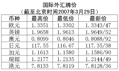 根據中國人民銀行授權中國外匯交易中心發布的公告,2007年3月29日銀行間外匯市場美元等交易貨幣對人民幣匯率的中間價為:1美元兌人民幣7.7303元,1歐元兌人民幣10.2906元,100日元兌人民幣6.6195元,1港幣兌人民幣0.98942元,1英鎊兌人民幣15.1783元。
