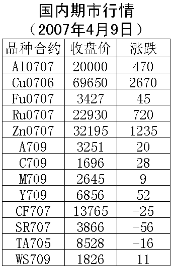4月9日國內期貨市場白糖下跌,金屬、能源、農產品價格全部飄紅。倫敦、美國市場上周五因復活節休市。滬銅706合約周一上漲2670元/噸,收盤69650元/噸,支撐價位68000元一線,上漲壓力71500元一線。滬鋁706合約周一上漲360元/噸,收盤19860元/噸,支撐19600元一線,上漲壓力20300元一線。