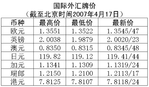 根據中國人民銀行授權中國外匯交易中心發布的公告,2007年4月17日銀行間外匯市場美元等交易貨幣對人民幣匯率的中間價為:1美元兌人民幣7.7308元,1歐元兌人民幣10.4625元,100日元兌人民幣6.4647元,1港幣兌人民幣0.98964元,1英鎊兌人民幣15.3827元。