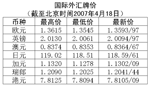 根據中國人民銀行授權中國外匯交易中心發布的公告,2007年4月18日銀行間外匯市場美元等交易貨幣對人民幣匯率的中間價為:1美元兌人民幣7.7238元,1歐元兌人民幣10.4916元,100日元兌人民幣6.5048元,1港幣兌人民幣0.98887元,1英鎊兌人民幣15.5105元。