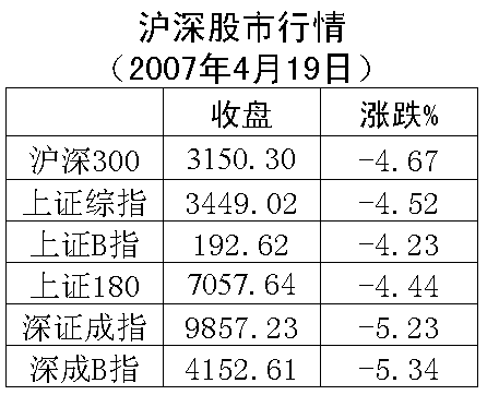 承接周三的下調,滬深股市大盤19日低開后出現近一個月來少見的大規模深幅下跌:上證綜指和深證成指分別下跌163點和544點,收報于3449.02點和9857.23,跌幅為4.52%、5.23%。