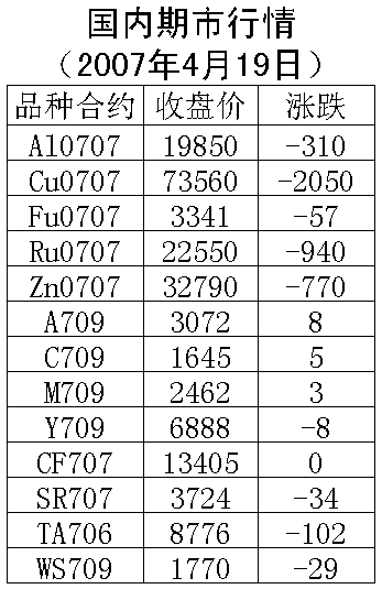 4月19日國內期貨市場除豆類產品其余品種全線下跌。倫敦銅周三下跌130美元/噸,收盤7955美元/噸。滬銅707合約周四下跌2050元/噸,收盤73560元/噸。倫敦鋁周三下跌10美元/噸,收盤2874。5美元/噸。滬鋁707合約周三下跌310遠/噸,收盤19850元/噸。