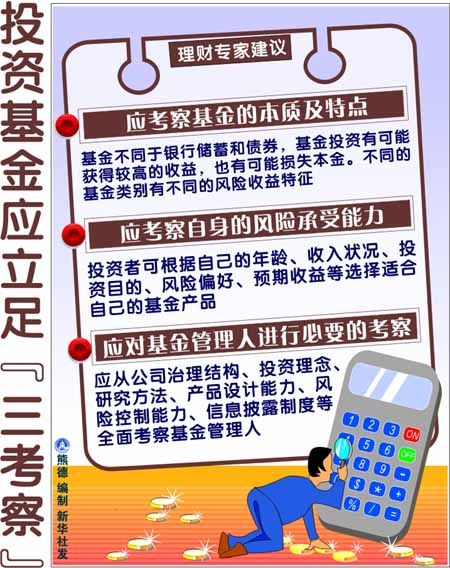 建設銀行從4月24日起發行華商基金公司的華商領先企業基金,并同時開展博時第三產業成長基金的集中申購工作。建設銀行江蘇省分行的理財專家建議,市民在挑選適合自己的基金產品前應對基金的本質及特點、自身的風險承受能力以及基金管理人進行考察。 要做明白的基金投資者,首先應考察基金的本質及特點。建設銀行江蘇省分行的理財專家表示,基金是一種利益共享、風險共擔的集合投資方式。投資者根據所持基金份額享受基金的收益,但同時也要承擔相應的投資風險;鸩煌阢y行儲蓄和債券,基金投資有可能獲得較高的收益,也有可能損失本金。不同的基金類別有不同的風險收益特征。一般來講,預期收益越高,承擔的風險也越大。 其次,投資者應考察自身的風險承受能力,并根據自身特點選擇適合自己的基金產品。投資者可根據自己的年齡、收入狀況、投資目的、風險偏好、預期收益等選擇適合自己的基金產品,并將自己的金融資產在儲蓄、保險、基金等投資工具中根據自身的風險承受能力和理財目標做合理配置,理性地進行投資決策。 最后,投資者還應對基金管理人進行必要的考察;鸸芾砣说穆氊熓秦撠熯\作基金資產,為投資者爭取最大的投資收益。因此,基金管理人的管理能力是取得基金業績的基礎。投資者應當從公司治理結構、投資理念、研究方法、產品設計能力、風險控制能力、信息披露制度等方面全面考察基金管理人。 此外,專家還提醒,市民在投資前,應認真閱讀風險提示函和基金公司的《基金合同》、《招募說明書》等基金法律文件。股票型基金、股債混合型基金,其資產的30%到95%投資于股票,因此,證券市場的價格波動會引起基金份額凈值波動,投資者要正確認識和對待證券投資基金可能出現的投資風險,并具備相應的風險承受能力。