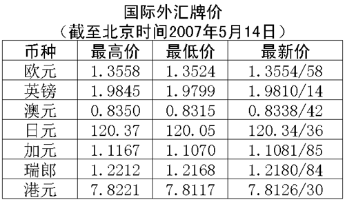 根據中國人民銀行授權中國外匯交易中心發布的公告,2007年5月14日銀行間外匯市場美元等交易貨幣對人民幣匯率的中間價為:1美元兌人民幣7.6739元,1歐元兌人民幣10.3866元,100日元兌人民幣6.3861元,1港幣兌人民幣0.98161元,1英鎊兌人民幣15.2150元。
