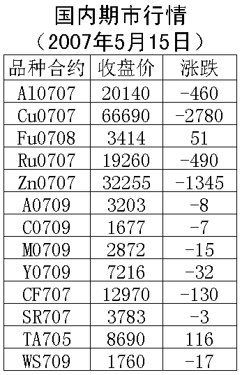 15日,國內期貨市場金屬、農產品價格下跌,燃油價格上漲。倫敦銅周一下跌235美元/噸,收盤7660美元/噸。滬銅707合約周二下跌2780元/噸,達到跌停板,收盤66690元/噸。倫敦鋁周一下跌47.5美元/噸,收盤2820美元/噸。滬鋁707合約周二下跌460元/噸,收盤20140元/噸。