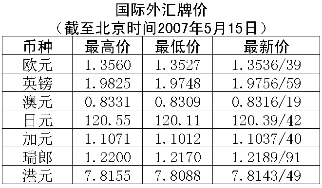 根據中國人民銀行授權中國外匯交易中心發布的公告,2007年5月15日銀行間外匯市場美元等交易貨幣對人民幣匯率的中間價為:1美元兌人民幣7.6948元,1歐元兌人民幣10.4203元,100日元兌人民幣6.3844元,1港幣兌人民幣0.98524元,1英鎊兌人民幣15.2272元。