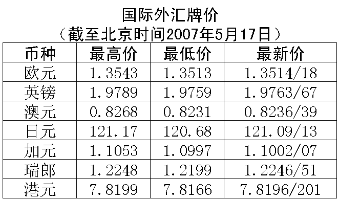 根據中國人民銀行授權中國外匯交易中心發布的公告,2007年5月17日銀行間外匯市場美元等交易貨幣對人民幣匯率的中間價為:1美元兌人民幣7.6785元,1歐元兌人民幣10.3875元,100日元兌人民幣6.3545元,1港幣兌人民幣0.98218元,1英鎊兌人民幣15.1858元。