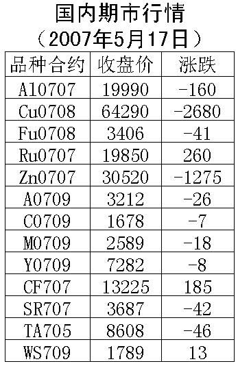 17日國內期貨市場金屬大幅下跌。倫敦銅周三下跌110美元/噸,收盤7630元/噸。滬銅707合約周四下跌2670元/噸,收盤63970元/噸達到跌停板,明日漲跌幅度擴大到5%,支撐價位63000元一線,上漲壓力65000元一線。倫敦鋁周三下跌4。5美元/噸,收盤2838美元/噸。滬鋁707合約周三下跌160元/噸,收盤19990元/噸。