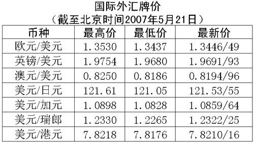 根據中國人民銀行授權中國外匯交易中心發布的公告,2007年5月21日銀行間外匯市場美元等交易貨幣對人民幣匯率的中間價為:1美元兌人民幣7.6652元,1歐元兌人民幣10.3649元,100日元兌人民幣6.3226元,1港幣兌人民幣0.98027元,1英鎊兌人民幣15.1349元。