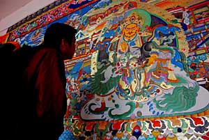 攝 | 2007中國·青海熱貢唐卡藝術品博覽會日前在藏族畫家之鄉——青海黃南藏族自治州同仁縣落幕,此次博覽會不僅展示了當代唐卡藝人的精美畫作,當地的幾所寺廟還首次拿出珍藏數百年的唐卡藝術珍品,吸引了眾多收藏愛好者。 據了解,隨著唐卡被納入首批國家非物質遺產名錄以及藏學熱的日漸升溫,唐卡正受到越來越多收藏家的關注,而唐卡繪畫這門藏族傳統技藝也隨著唐卡收藏熱的興起得到了前所未有的發展。但在經濟利益的驅動下,目前唐卡市場也出現了以新充舊、顏料作假、粗制濫造等現象。有關專家認為,只有盡快加以規范,才能讓唐卡藝術保持長久的生命力。