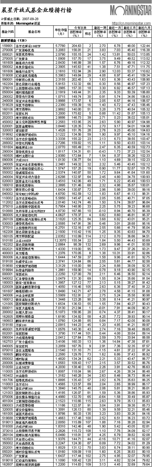 晨星開放式基金業績排行榜[2007-09-28]