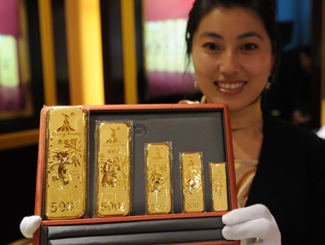 日前,亞運金條上市。亞運吉祥金條共設50、100、200、500、1000克五種規格。第16屆亞運會將于2010年在中國廣州舉行。新華社記者 李文 攝